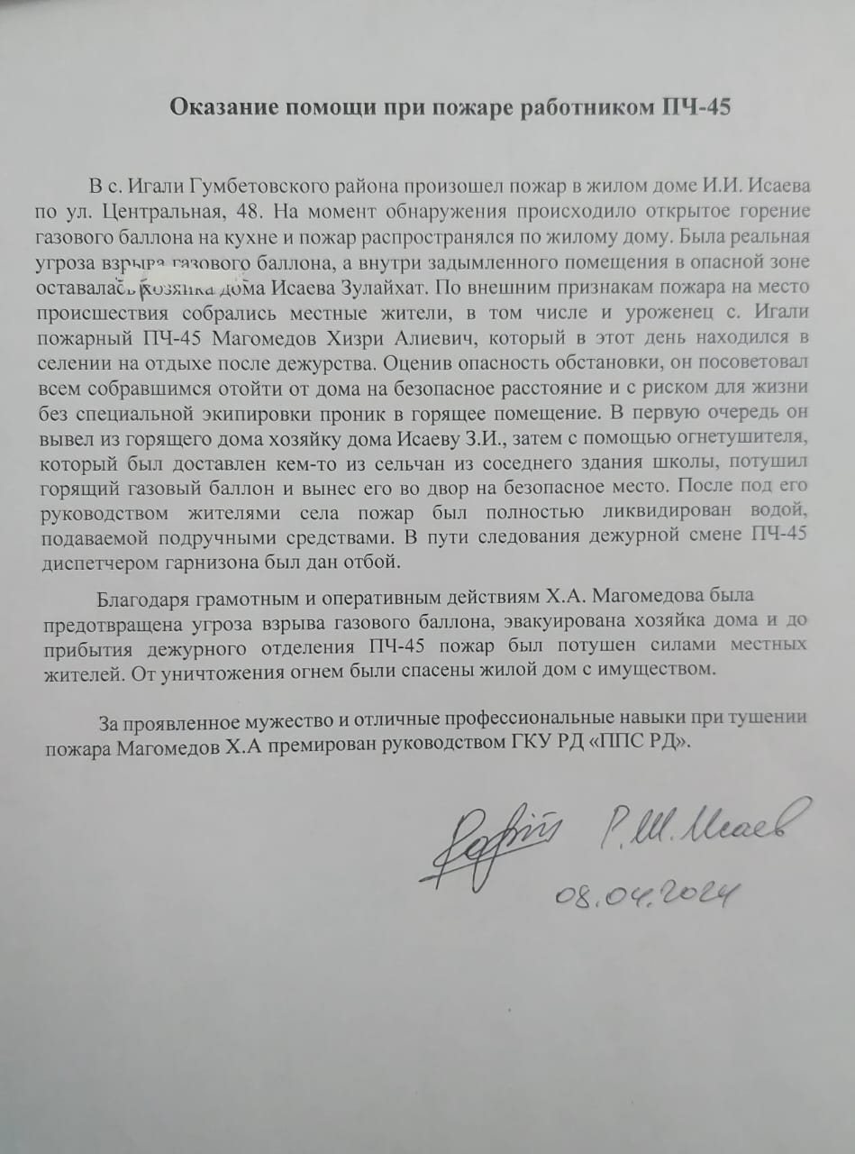 Игали пожарный ПЧ-45 Магомедов Хизри Алиевич, который в этот день находился в селении на отдыхе после дежурства. Оценив опасность обстановки, он посоветовал всем собравшимся отойти от дома на безопасное расстояние и с риском для жизни без специальной экипировки проник в горящее помещение. В первую очередь он вывел из горящего дома хозяйку дома Исаеву З.И., затем с помощью огнетушителя, который был доставлен кем-то из сельчан из соседнего здания школы, потушил горящий газовый баллон и вынес его во двор на безопасное место.