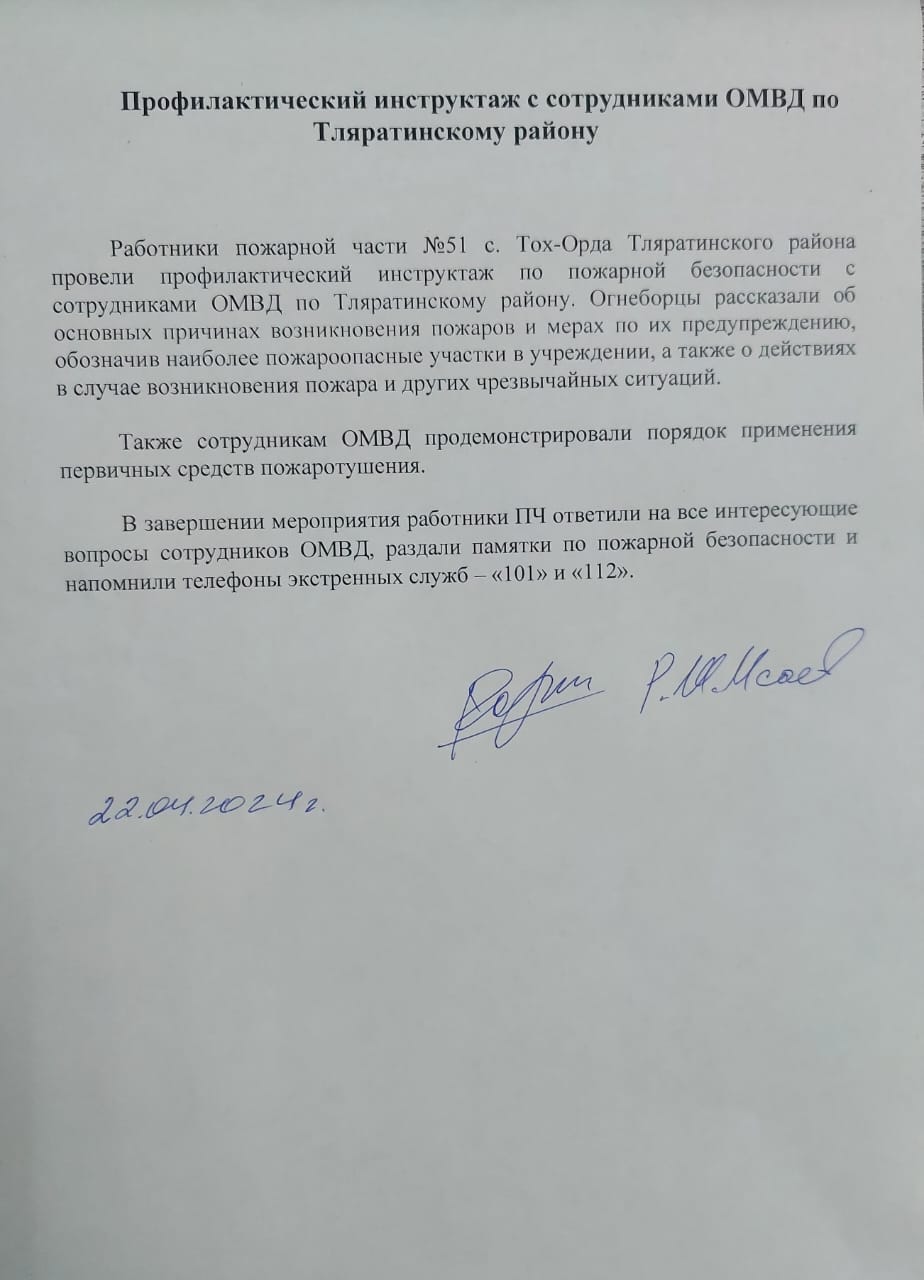 Работники пожарной части №51 с. Тох-Орда Тляратинского района провели профилактический инструктаж по пожарной безопасности с сотрудниками ОМВД по Тляратинскому району. Огнеборцы рассказали об основных причинах возникновения пожаров и мерах по их предупреждению, обозначив наиболее пожароопасные участки в учреждении, а также о действиях в случае возникновения пожара и других чрезвычайных ситуаций.
