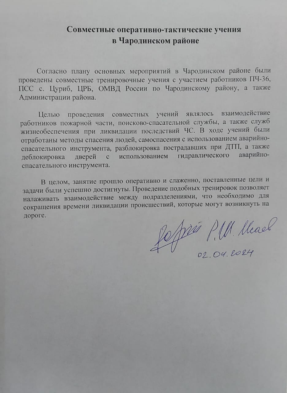 Согласно плану основных мероприятий в Чародинском районе были проведены совместные тренировочные учения с участием работников ПЧ-36, ПСС с. Цуриб, ЦРБ, ОМВД России по Чародинскому району, а также Администрации района. Целью проведения совместных учений являлось взаимодействие работников пожарной части, поисково-спасательной службы, а также служб жизнеобеспечения при ликвидации последствий ЧС.