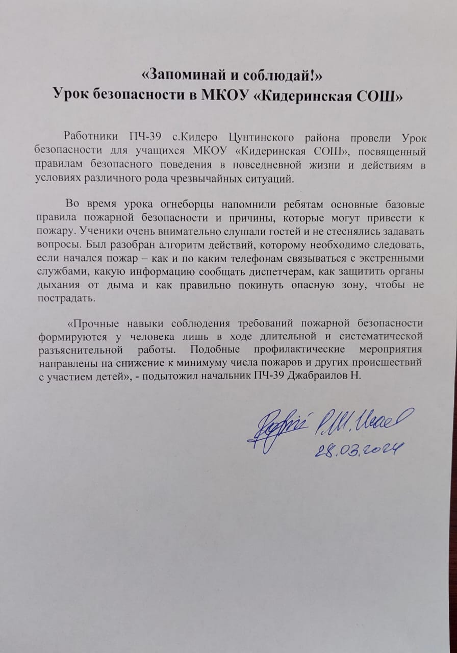 "Запоминай и соблюдай!" Урок безопасности в МКОУ "Кидеринская СОШ"